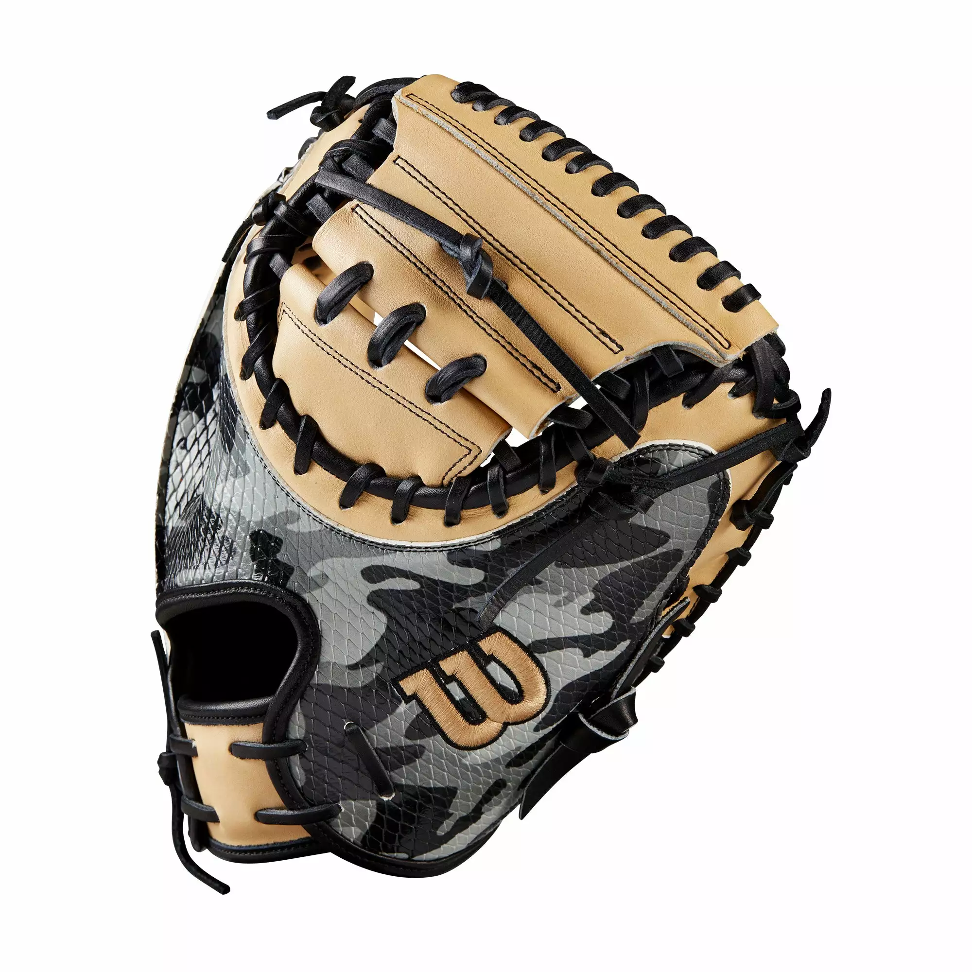 Opposing baserunners won’t even see it coming. Thwart stolen base attempts with October’s GOTM, an A2000® CM33SS with Black and White camouflage SuperSnakeSkin™ to reduce glove weight and improve durability. This mitt’s deep pocket, Blonde Pro Stock® Leather and Half-Moon Web help backstops frame every pitch on the black.